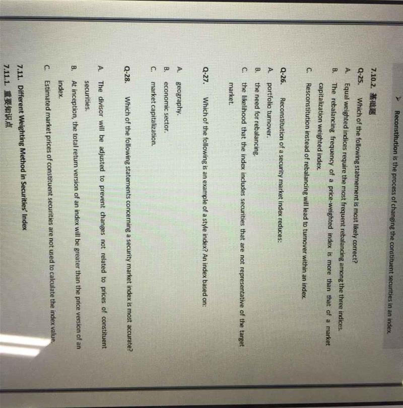 28说的是一些不是正常价格涨跌导致的变化,比如说送股,那股价也会下跌对不对,但是这个并不是股价真实的下跌了,这种因素要剔除,调整分母divisor;C说的估计的价格都不用,这个肯定不对,因为固定收益,另类投资等指数有时没有活跃的交易报价,需要用估计的价格。