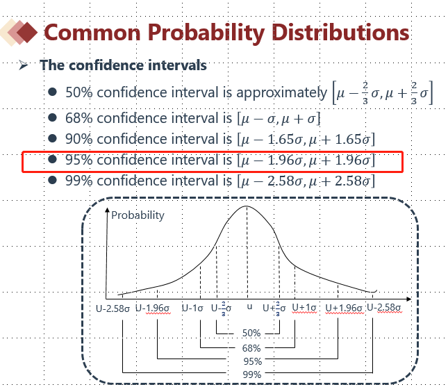 所有的正态分布都会满足以下截图一的规律,例如,均值上下1.96倍标准差的区间,对应95%的概率