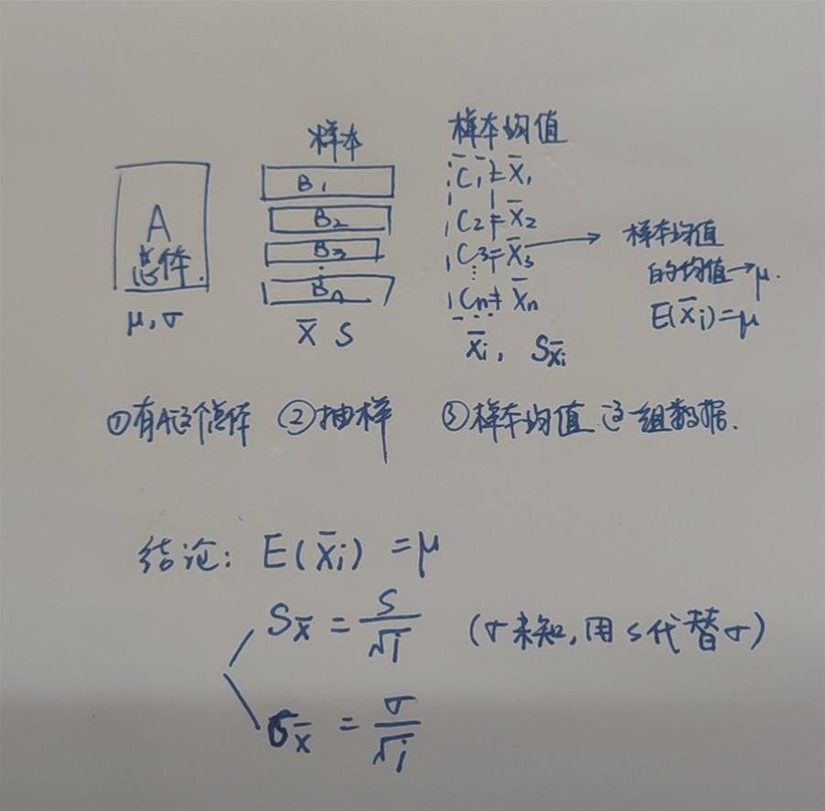 中心极限定理的应用不限分布,说的是,抽样样本容量大于30,样本均值服从正态分布,样本均值的期望=总体均值,样本均值的标准差(标准误)=样本标准差/根号n,过程如截图二三