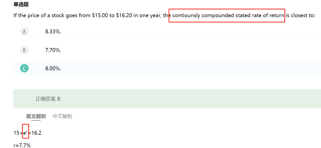 题目问到了“contiounsly compounded stated rate of return”,一定是e的“r”次方,求的是r