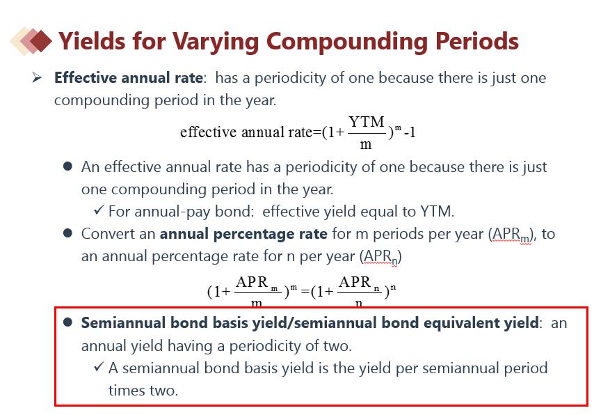 具体理解这个概念的意思,举个例子:if a bond yield is 2% per semiannual period, its annual yield is 4% when stated on a semiannual bond basis.