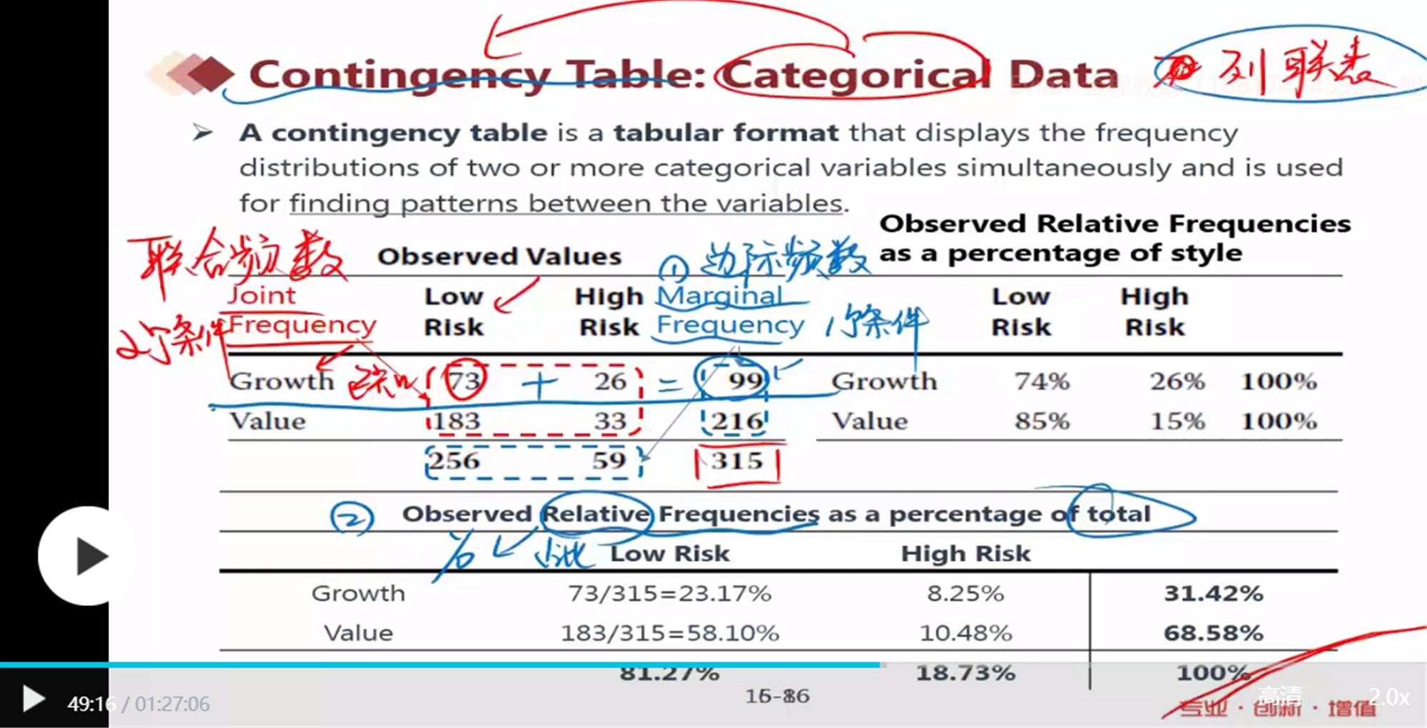 49分这里,列联表的相对频数计算,这个是以growth和value分类的,如果以low highrisk分类也可以吧