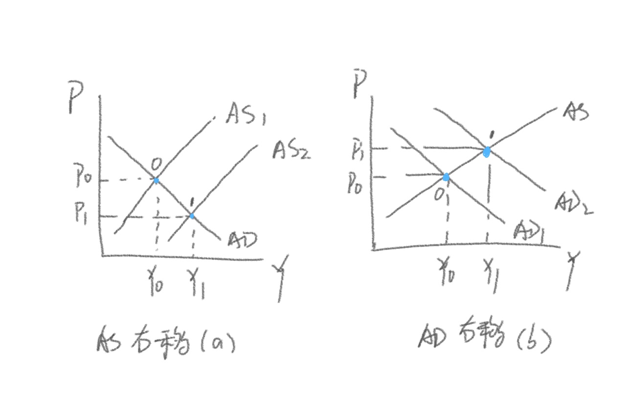 对于AS曲线来讲,曲线向右平移的话,会使得Q增加,P下降,如下图a