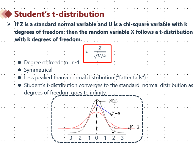 因此,从t分布的定义式出发,可以简单理解为是对Z分布进行一个修正,这个修正过程,可以近似看成是一个标准化的过程(会用到自由度df)。