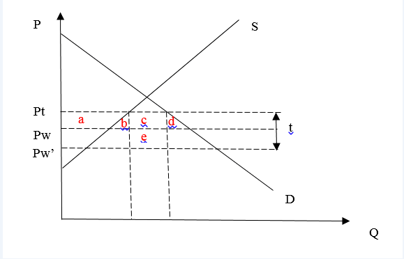用图形分析:征收关税后的大国国内的市场价格 Pt = 征收关税后的世界价格Pw´+关税t。此时,大国的政府获得的财政收入也是增加的,增加的部分如下图一中e区域。因此,理论上,当1)贸易伙伴不采取报复措施,2)关税带来的无谓损失(b+d)小于改善贸易条件带来的好处e时,大国就有可以通过征收关税来提高其福利。