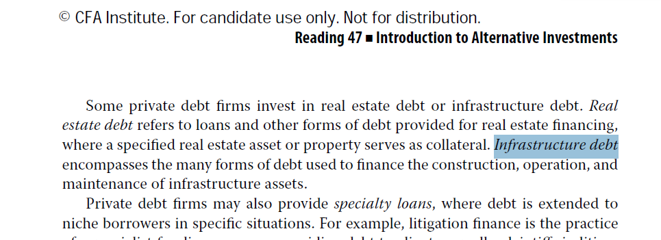 如截图,考纲仅要求判断风险和收益的高低,具体Infrastructure debt含义如截图2:包括用于为建设、运营和融资的多种形式的债务基础设施资产的维护。