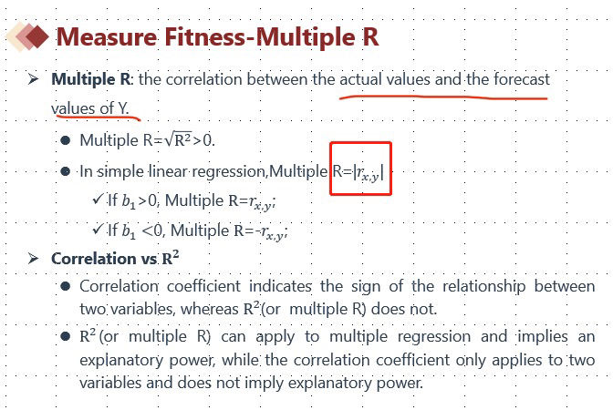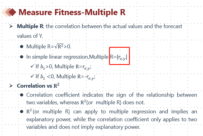 如果在多元回归(CF二级数量涉及内容)中,Multiple R就不能描述为Y和X的相关系数了