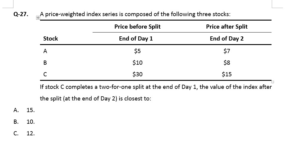 4. 股票价格变化的指数价格=(7 +8 +15)/拆股后调整的新分母(2)= 15