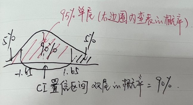 90%的双尾下k(z值)=1.65,其实就是两边尾巴面积加起来是10%,右边单尾是5%,那么剩下左边的总面积是95%,左边的总面积代表Z小于1.65的概率。