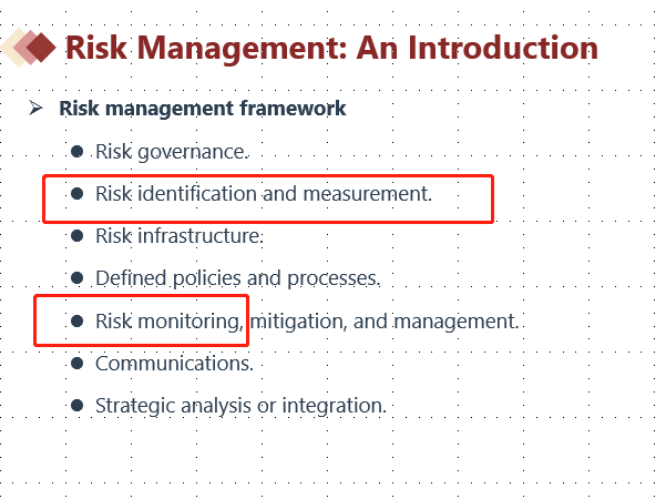 这题是从“Risk management framework”挑选的重要步骤(风险管理框架的重要步骤:识别风险、衡量风险、监测风险),也是流程图的前三项