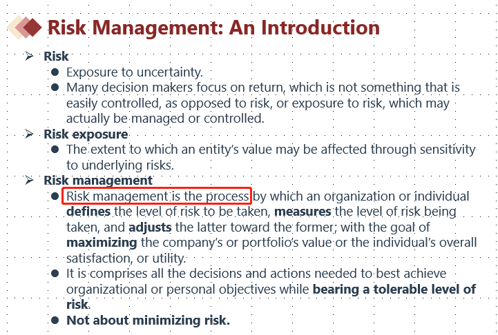 risk management本身是一个进程,我们在这个进程中需要确定“要承担的风险”以及衡量“要承担的风险”,并且随着企业的经营调整“要承担的风险”