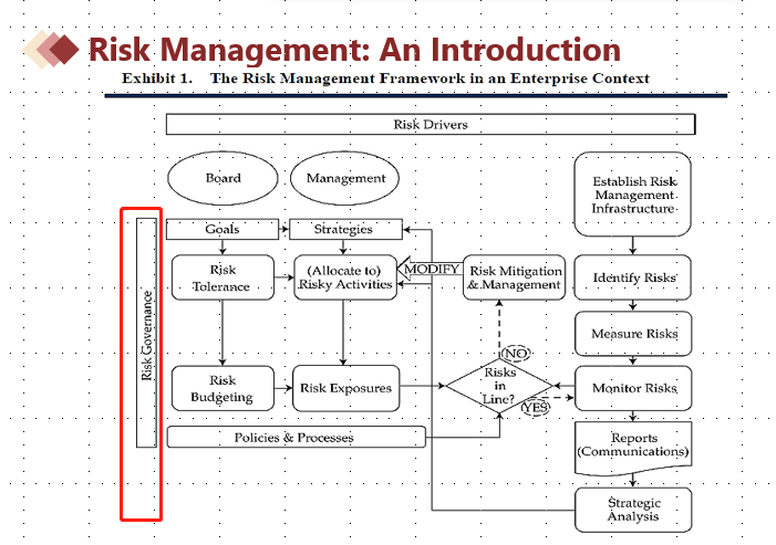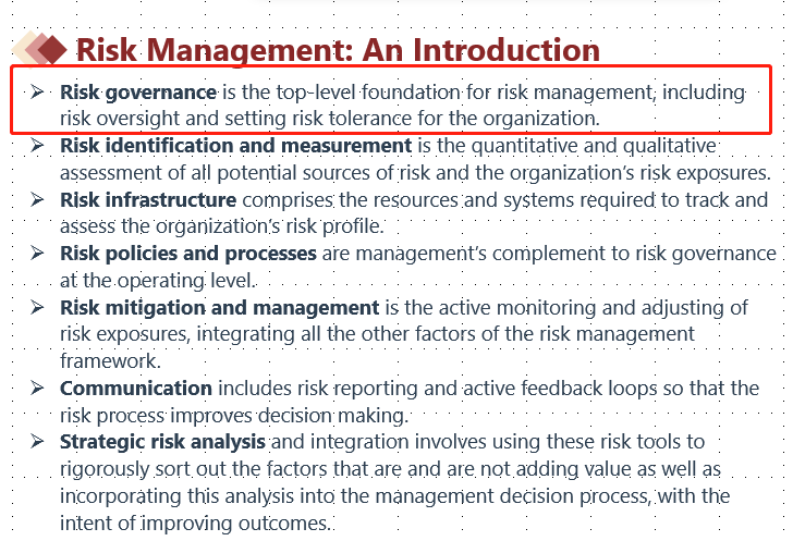 风险治理是风险管理的最高一级基础,包括对风险的监督和为组织设定风险容忍度。