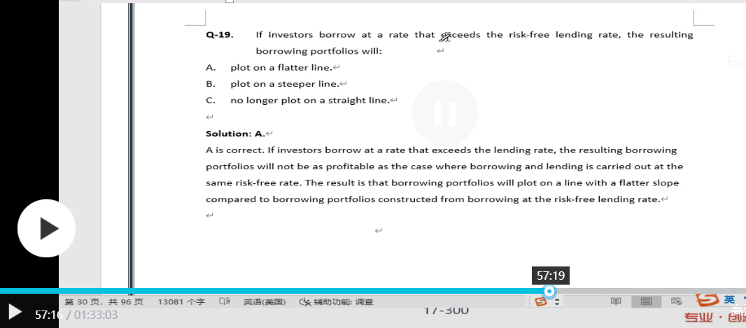 “a rate that excedds the risk free lending rate”这个借款利率超过了无风险收益率,说明CML(过Rf向EF做切线在实际投资中不可实行),实际是过“比Rf要高的点”向EF(不变)做切线,此时的切线变得平缓