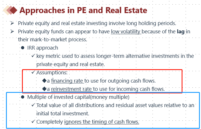 讲义红色框,具体公式(MOIC=(NAV+all distribution)/total capital investment=(净资产价值+分红)/初始投资,例如我投了100元,现在资产价值和分红一共200元,MOIC=2,说明投资增值了1倍)不需要掌握,因为三级会考计算,以及不考