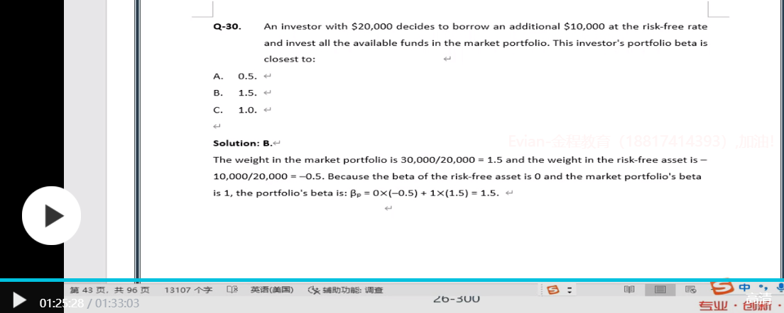 β就是表示市场变动,对投资组合带来的影响嘛。现在他自有2W,作为EQUITY,然后借入了1W,共有3W当做ASset。A/E就是杠杆,当市场变动时,对资产盈亏的影响。类比做这里的β。这种思路与对吗