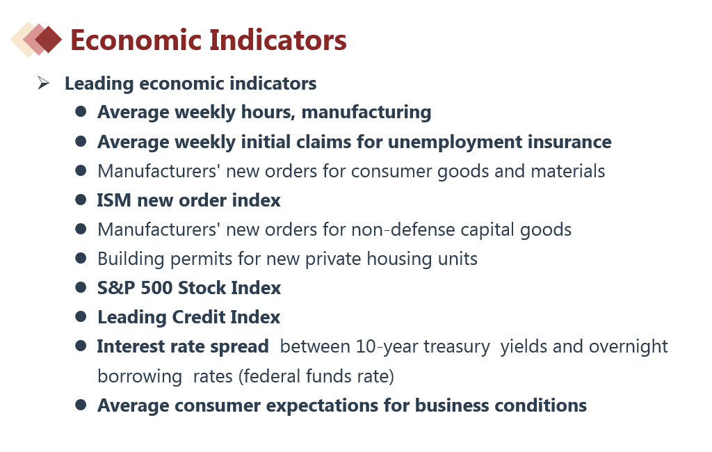 同步指标中:实际个人收入(同步显示了当前经济状况)、工业生产指数(衡量制造业、矿业与公共事业的实际产出,反映的是某一时期工业经济的景气状况和发展趋势)、制造与贸易总额(它衡量了一个经济体当前的实际产出)这三个指标。