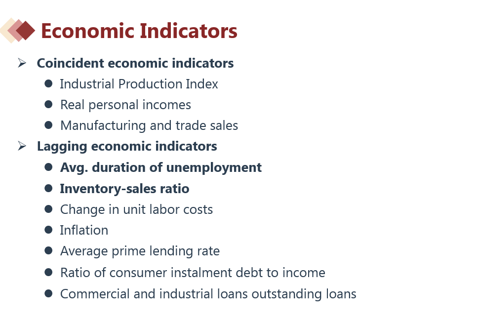 因此,题目中所提及到的: aggregate real personal income, industrial output都属于与经济周期同步变动的指标,当他们向好的时候,表示当前经济处于正在向好的阶段。而the S&P 500 Index,它是先行指标之一,它增加意味着经济未来形式是向好发展的。
