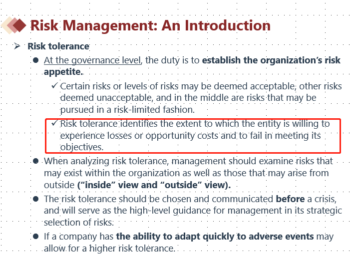 题目问的是在确定risk tolerance的情况下,risk mangement应该做啥