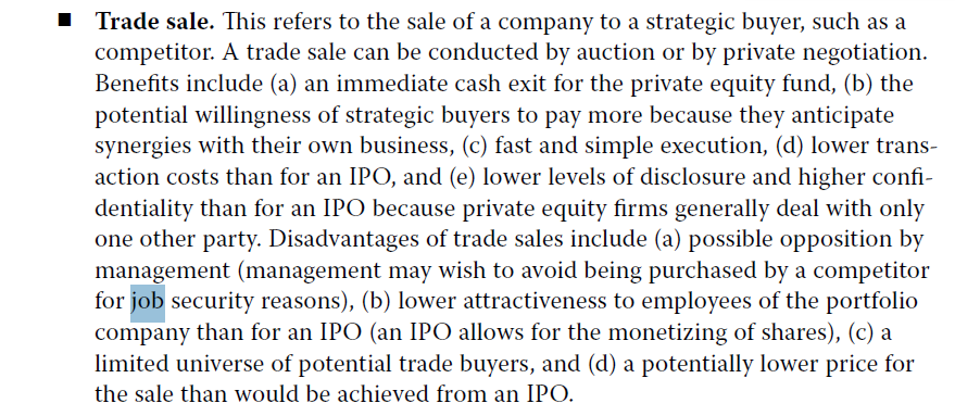 为了工作安全性考虑,标的公司如果被卖给了竞争对手(trade sale),那么标的公司的管理层可能会被换,如果是IPO就没有这种担忧