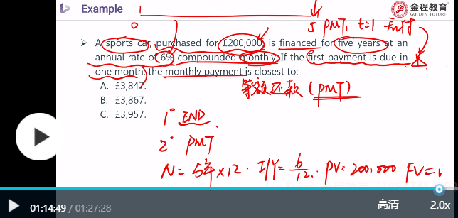 首先找现金流,我们找到了PMT是月供,再确定月供的频率,是一年12次,那么5年就是60次(N=60),PMT现金流对应的利率一定是月利率I/Y=6/12=0.5