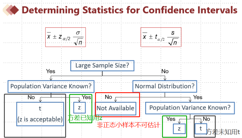 在选择合适的检验统计量时,我们有一个流程图,如下截图,为了方便记忆,有以下3句话: