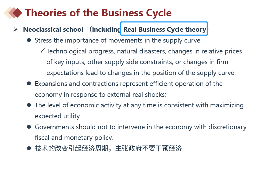 认为技术进步、自然灾害、投入要素的相对价格的变化、其他供给约束或企业预期的变化都将会导致供给曲线位置的变化。因此,RBC理论认为,扩张和收缩代表经济在应对外部实际冲击时的有效运行;任何时候的经济活动水平都与预期效用最大化相一致。因此,新兴古典主义学派(包括RBC理论)的政策建议是,政府不要以自由裁量的财政和货币政策干预经济。