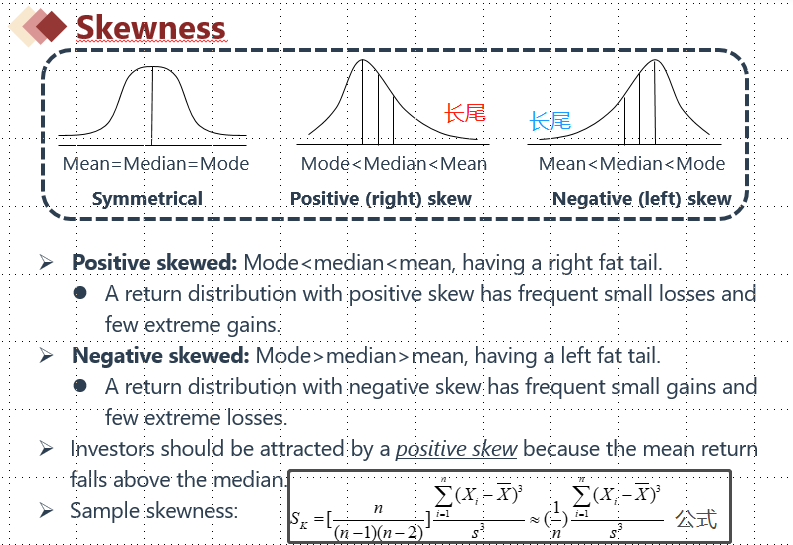 如果从公式角度来判断随机变量呈现的分布是左偏还是右偏,我们需要从公式的结果来判断