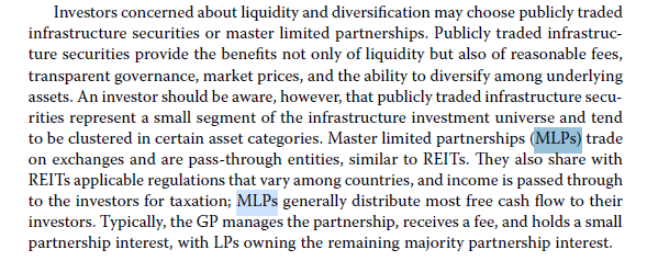 Master limited partnerships (MLPs) trade on exchanges and are pass-through entities, similar to REITs. They also share with REITs applicable regulations that vary among countries, and income is passed through to the investors for taxation; MLPs generally distribute most free cash flow to their investors.