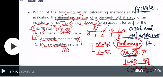 MWRR(本质为IRR)是衡量资金管理者(基金经理)增资撤资的能力,而题目给的信息是“buy-and-hold strategy”相当于定投/买入并持有,此时资金管理者无法控制现金流流入流出,而这些现金流影响了IRR的大小。如果用MWRR来衡量基金经理的能力,会有失偏颇。