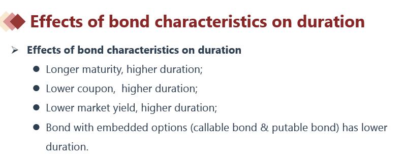 这里影响凸性和影响久期的因素是一样的,可以直接理解为如何影响久期就是如何影响凸性的。见下图讲义有关久期的影响因素。