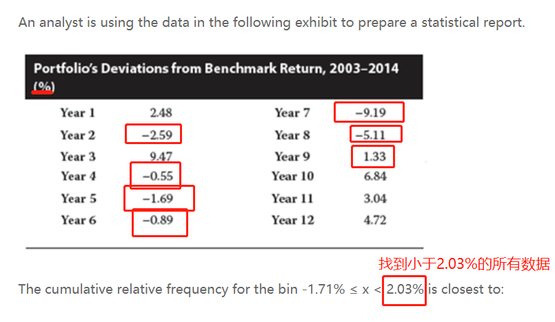 题目中cumulative relative frequency是累积相对频率的意思,我们需要考虑小于"区间上限2.03%"的所有观测值占总观测值的比重,不考虑“2.03%”以上的观测值,应该考虑“2.03%”以下的所有观测值