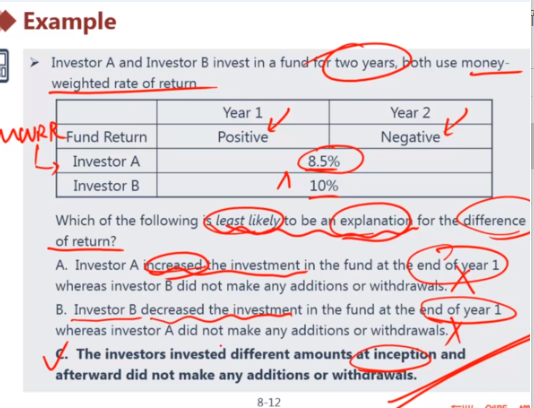 投资期间没有发生现金流(撤资增资),A和B两个投资者的MWRR应该是相同的,但是,题目给出了两个不相同的数字:10%高于8.5%。