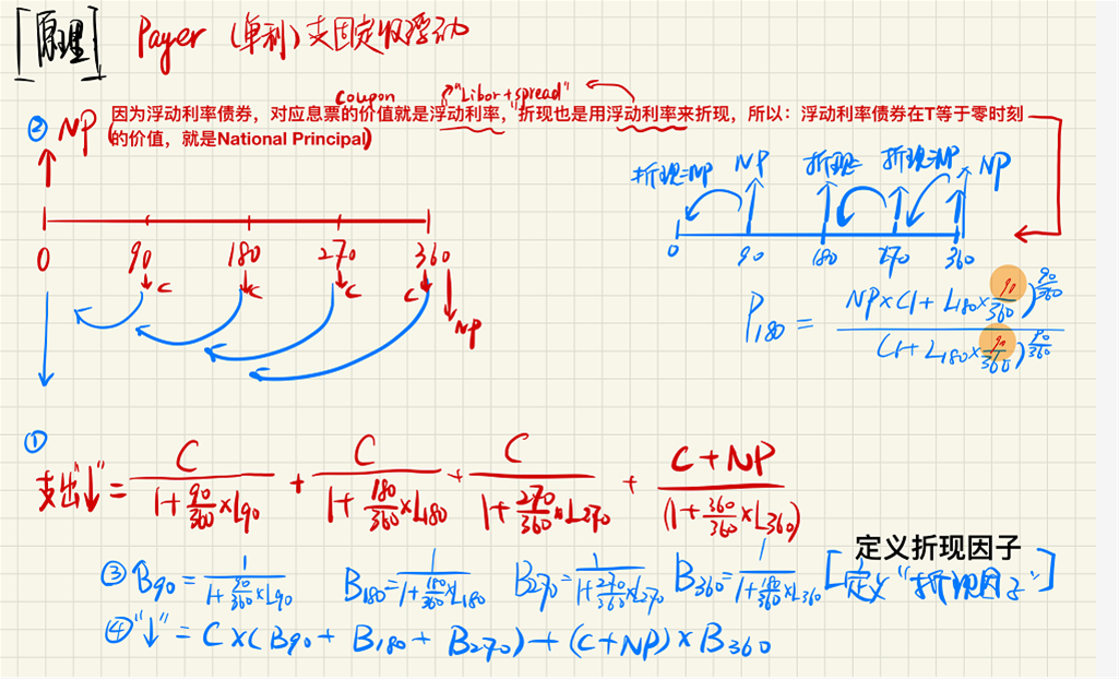假设现在站在收浮动,支出固定,利用一年4次付息的浮动债券和固定债券给swap定价。按照步骤,期初时间点,无论浮动换固定还是相反,参与的任意一方,支付与收到的钱在价值上是相等的。折现率是浮动利率,所以: