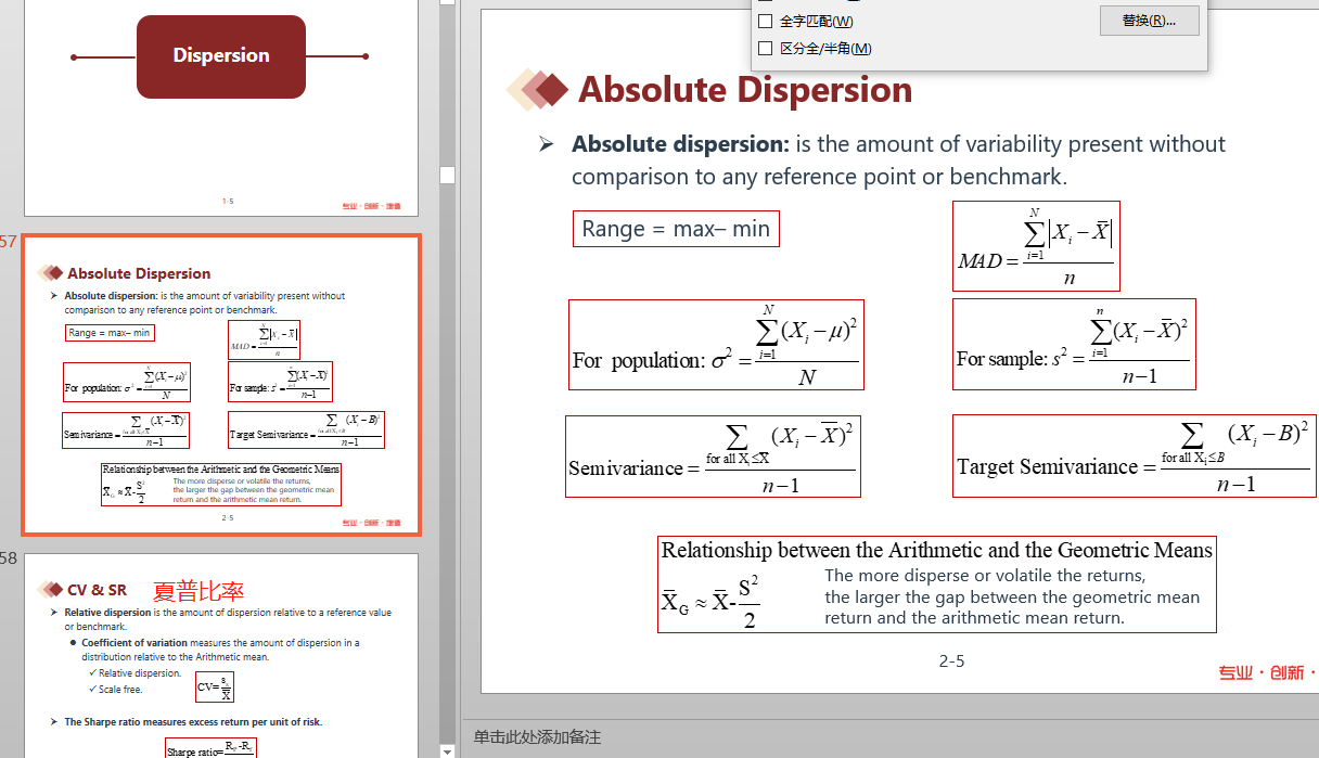 在dispersion这个知识点中,我们有学习标准差和夏普比率