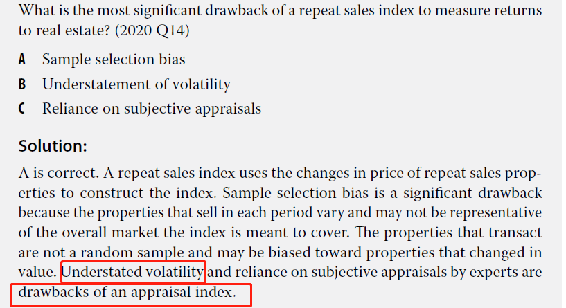 如下截图,原版书题目,原版书认为repeat sales index的缺点是“样本选择偏差”,也就是选取的房价样本数据无法真实反映整个市场情况(可能高估也可能低估)