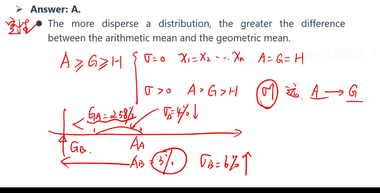 题目给出的信息说明,两组数据(X和Y)的算术平均值相等(3%),其中X这组数据的标准差较大(数据离散程度较大),Y这组数据的标准差较小(数据离散程度较小)。按照以下截图公式,A算术平均值不变的情况下,标准差越大,几何平均数越小,X这组数据的几何平均数较小