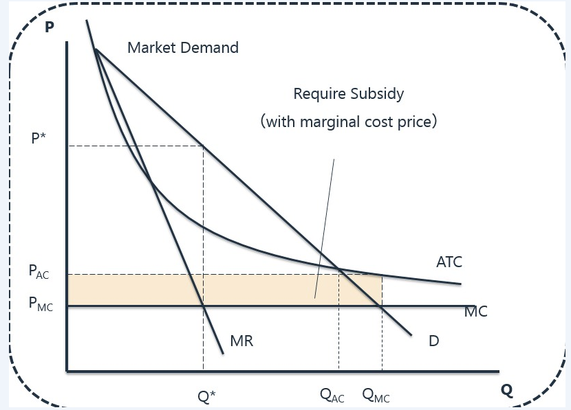 2)边际成本定价法,即要求厂商降低价格至P=MC,从图中可以清楚地看到:当采用边际成本定价法时,企业提供商品的价格PMC,产量为QMC,由于PMC<PAC,会导致厂商收入无法覆盖成本,产生经济损失。任何一家企业,在长期内如果一直蒙受经济损失,一定会退出市场。所以为了防止企业离开市场,政策制定者就必须通过各种方式鼓励企业继续留在这个市场,最常见的一种方式就是政府给予垄断者补贴,而补贴的金额应当等于企业经济损失的部分。