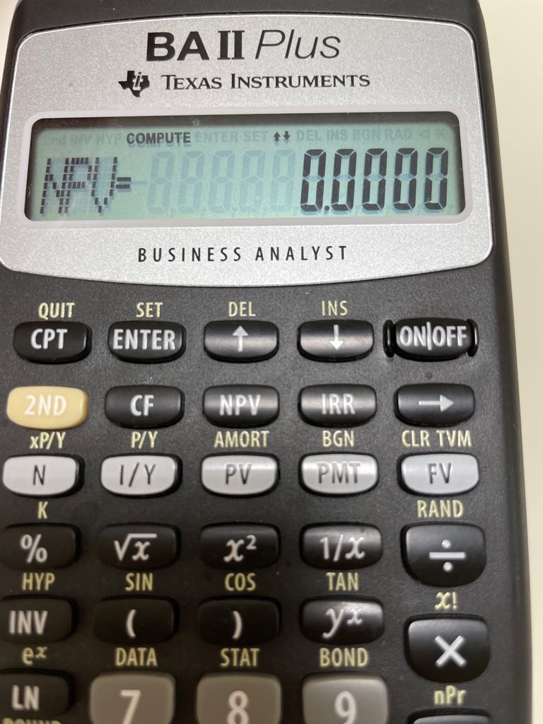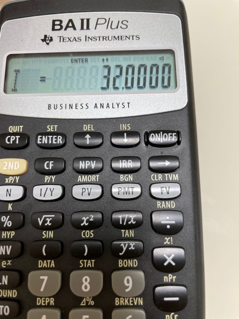 同学你好,输入32之后,需要按一下enter,表示32输入到了计算器中,再按向下箭头,计算出来的NPV=4.02,而不是0哈