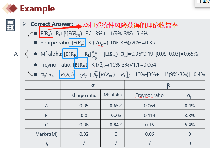 请问这里的sharpratio中为什么不是第一问算出的百分之9.6进行计算呢?9.6和题目中A的return百分之十有什么区别呢?sharpratio