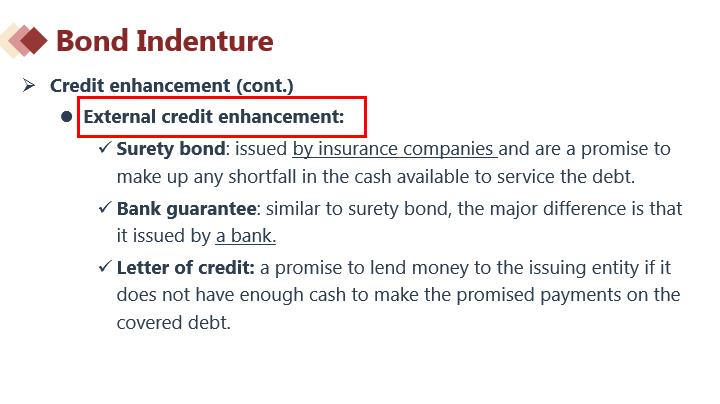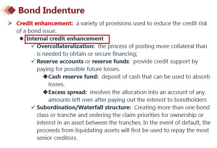 内部信用增级和外部信用增级分别有几种不同的形式,具体见下图讲义。