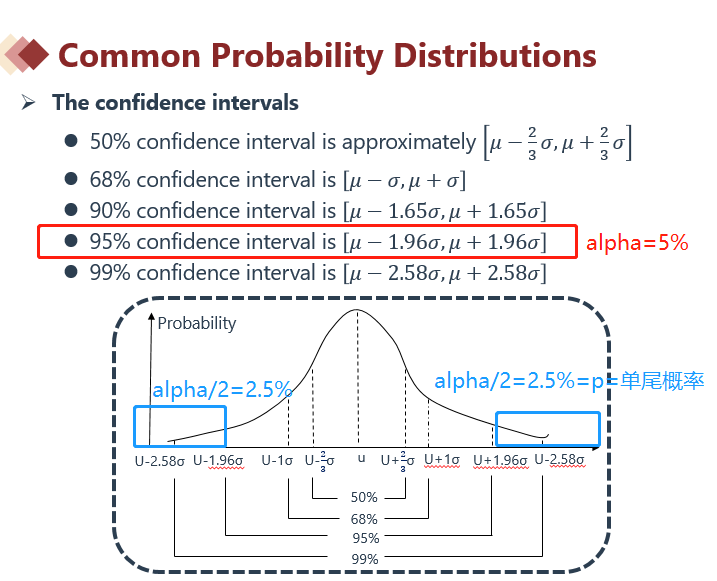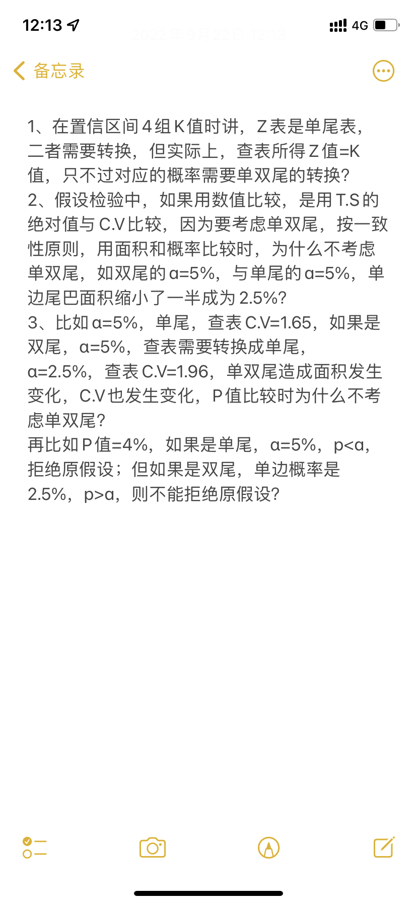 2、假设检验中,如果用数值比较,是用TS的绝对值与CV比较,因为要考虑单双尾,按一致性原则,用面积和概率比较时,为什么不考虑单双尾,如双尾的a=5%,与单尾的a=5%,单 边尾巴面积缩小了一半成为2.5%?
