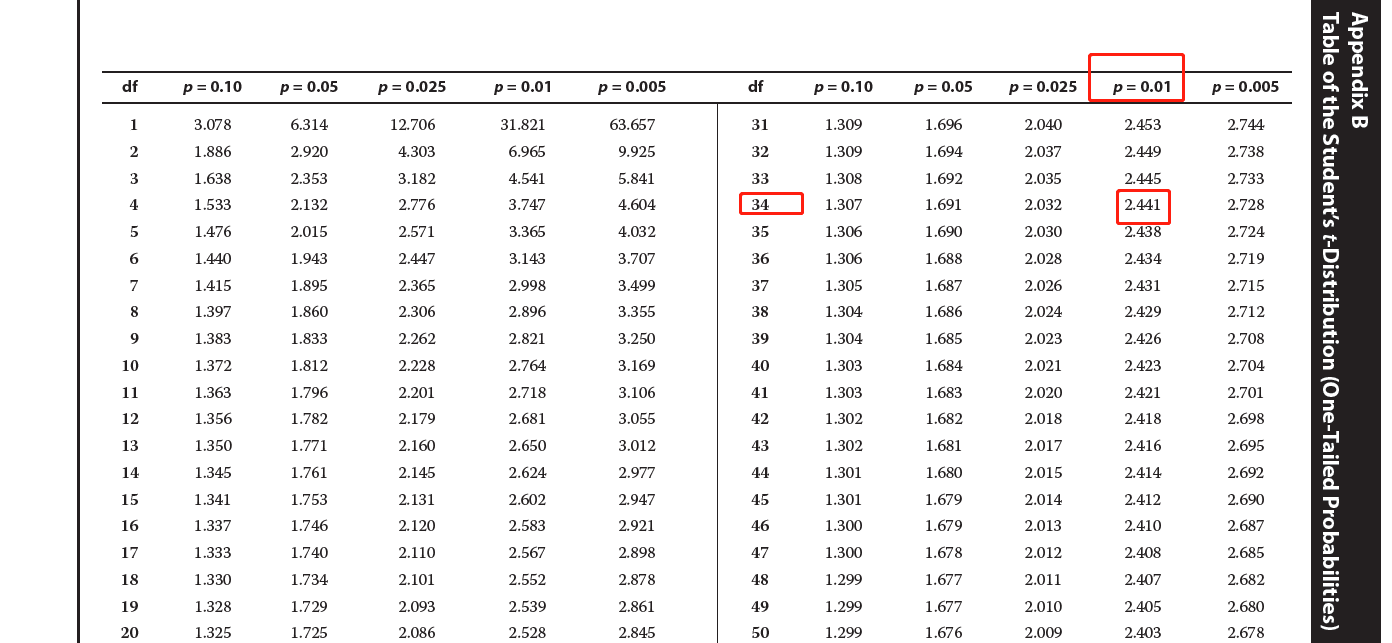 【回复】嗯嗯,是的,给出了自由度为34时,t学生分布的关键值2.4411