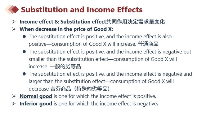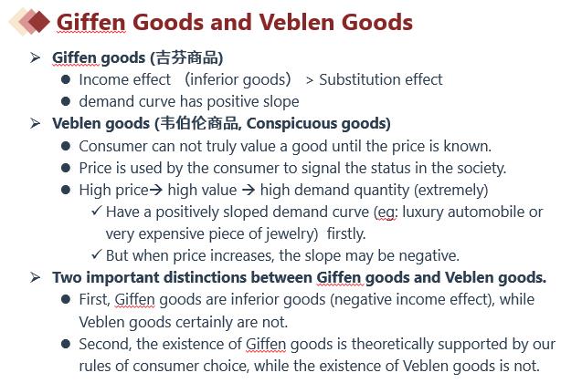 同学你好,这些都是有讲解的。当收入上升时,劣等品的需求会下降,而当劣等品的价格下降时,其需求会上升。对于积分商品而言,收入效应会强于替代效应,导致物价上涨时,吉芬商品的需求会下降,通常是低端品。凡勃伦商品类似于炫耀性消费,如果商品定价越高,则人们越会去买他以彰显自己的身份,于是价格越高、需求量越高。