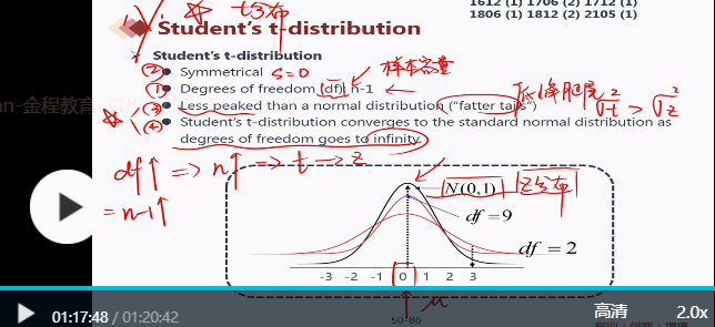 因为t学生分布的自由度和样本容量有一个固定的关系:df=n-1,自由度上升等价于样本容量上升