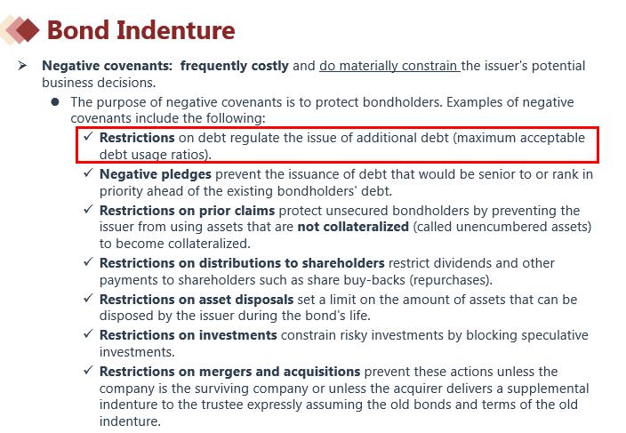 Restrictions on debt 这个条款说的是规定了额外债券的发行,也就是限制债券的发行量。所以可以保护债券持有人免受其债权稀释。