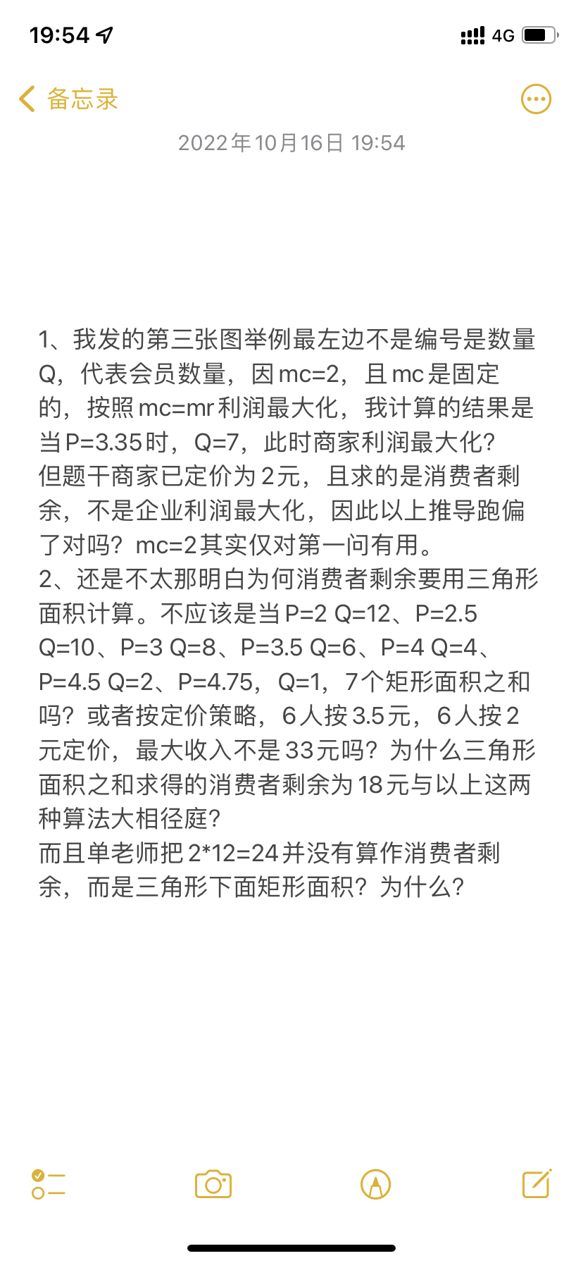 同学你好,关键就在于这个需求曲线是向下倾斜的,就好比你给所有的消费者排号码,最左边的1号消费者愿意出4.5元去club,旁边的2号消费者愿意出4元去club,在旁边的3号消费者愿意出3.5元,以此类推。那目前价格是2元,总共有12人愿意去,但是每个人心理价位是不一样的,有的人只愿意出2元,有的人愿意出3元,有的人愿意出4元。那现在可以对每个人额外加收费用,于是对那些愿意出4.5元的人可以加收2.5,愿意出3元的人加收1元,只愿出2元的人就不加钱,这样把三角形所包含的所有消费者剩余全部都赚掉,这是他的思路。