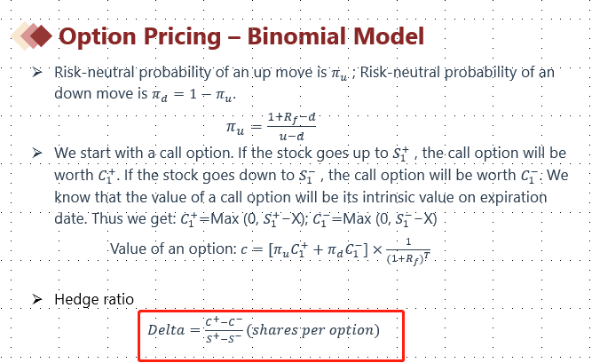 Delta具体的含义在二级衍生品中学习,二叉树模型延伸知识点是我们构建了一个投资组合,其中包含long一份期权,short delta份股票