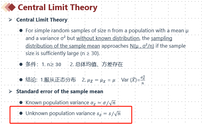 根据中心极限定理,计算样本均值的标准差(标准误)时,在总体方差未知情况下,用样本标准差代替总体标准差作为分子,用根号n作为分母,不涉及n-1