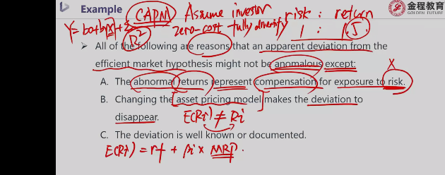 B不属于市场异常的表现。因为我们有很多模型来分析资产收益率,例如一级组合中学习的单因子模型market model (Ri=αi+βiRm+ei),我们在找资产收益和市场组合收益之间的关系,如果ei不为零,说明有异常收益,有这个模型解释不了的收益。但是,将market model 换成multifactor models多因子模型,之前ei可能消失,被更多的风险因子解释。
