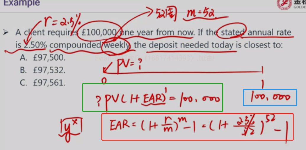 老师,16分钟这道题的公式不应该是FV=PV(1+EAR)n次方,为什么解析倒过来了,还有为什么那个52次方是负数呢?